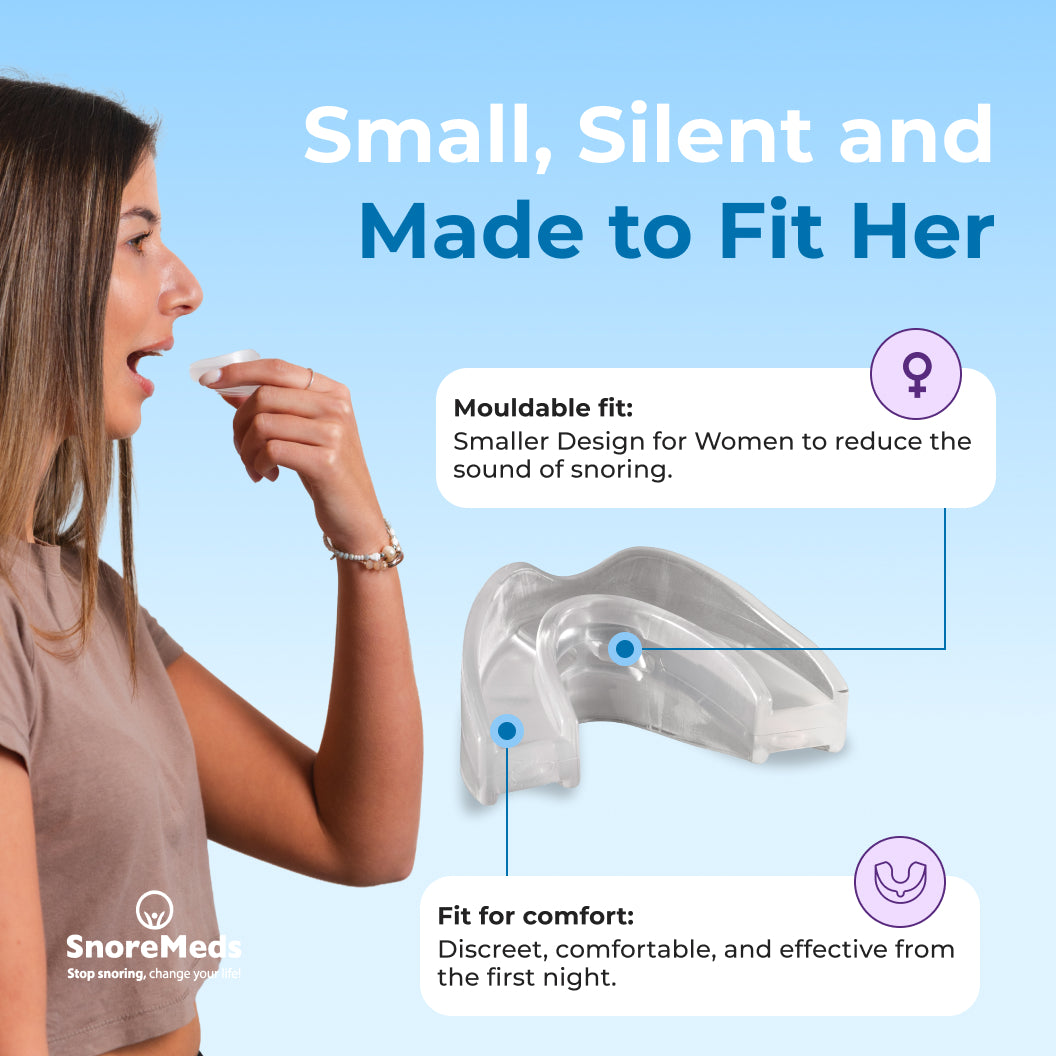 SnoreMeds™ for Women is a custom-fit anti-snoring mouthpiece designed with a slimmer, more discreet profile to support quiet, comfortable sleep.